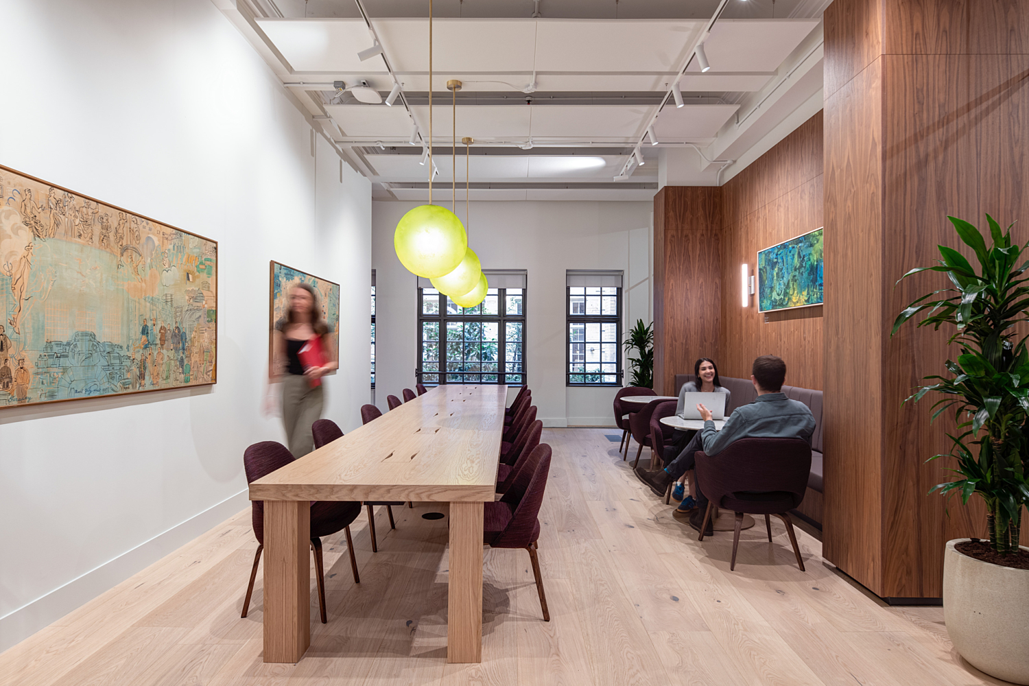 Taking Greystar's brief, we focused on preserving, enhancing and showcasing The Gilbert's original structure. This included celebrating the high ceilings and original windows, which are prominent focal points in the design. The large arched window on the first floor has been framed by a comfortable seating area that links visually with the grand reception downstairs. This careful design integration has allowed us to blend heritage with modern office functionality naturally.
