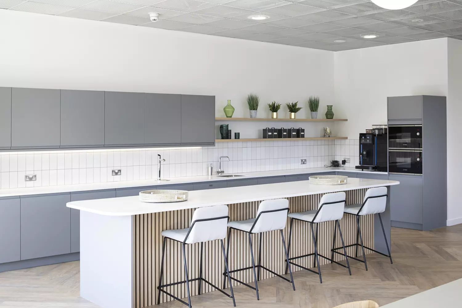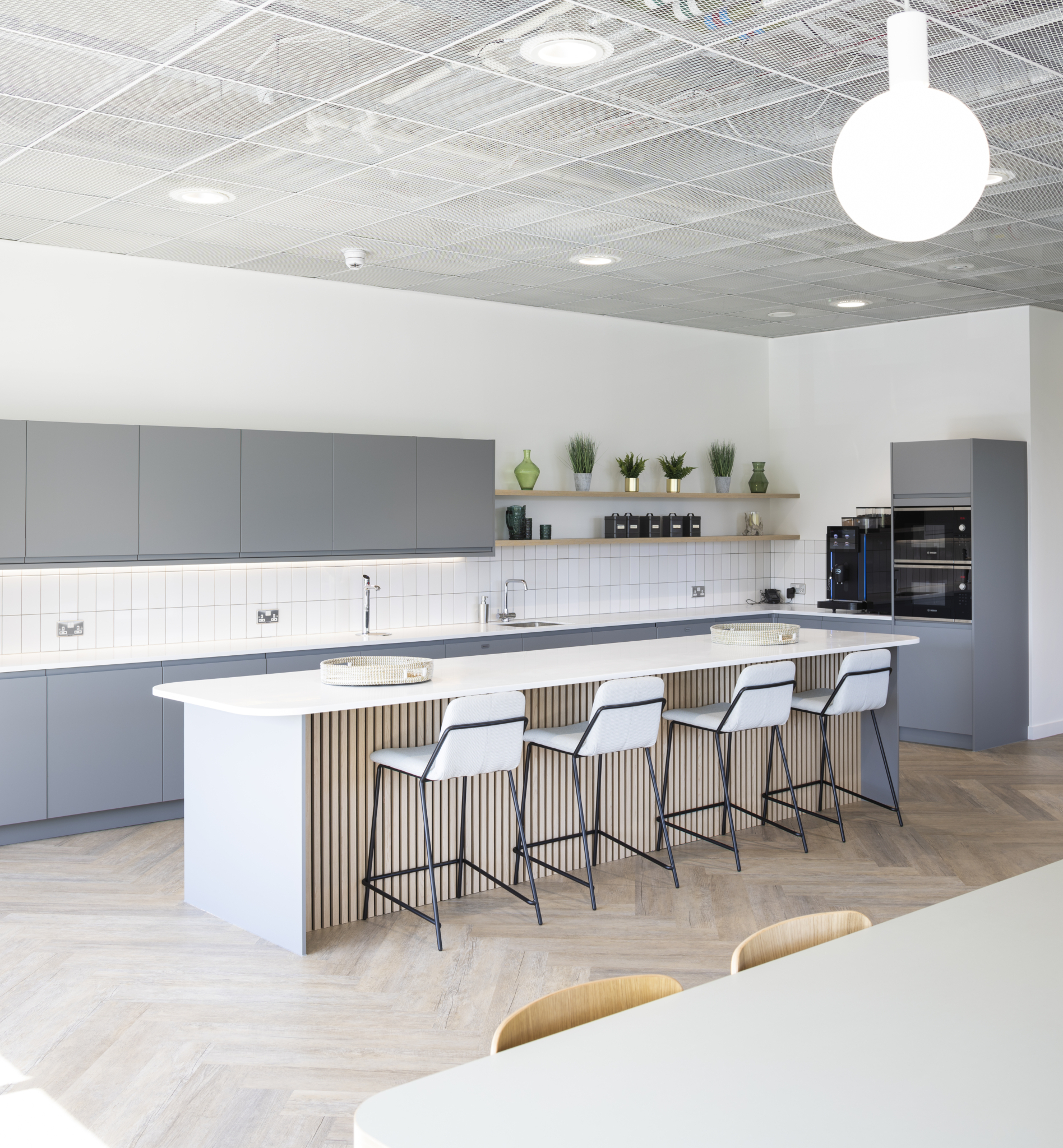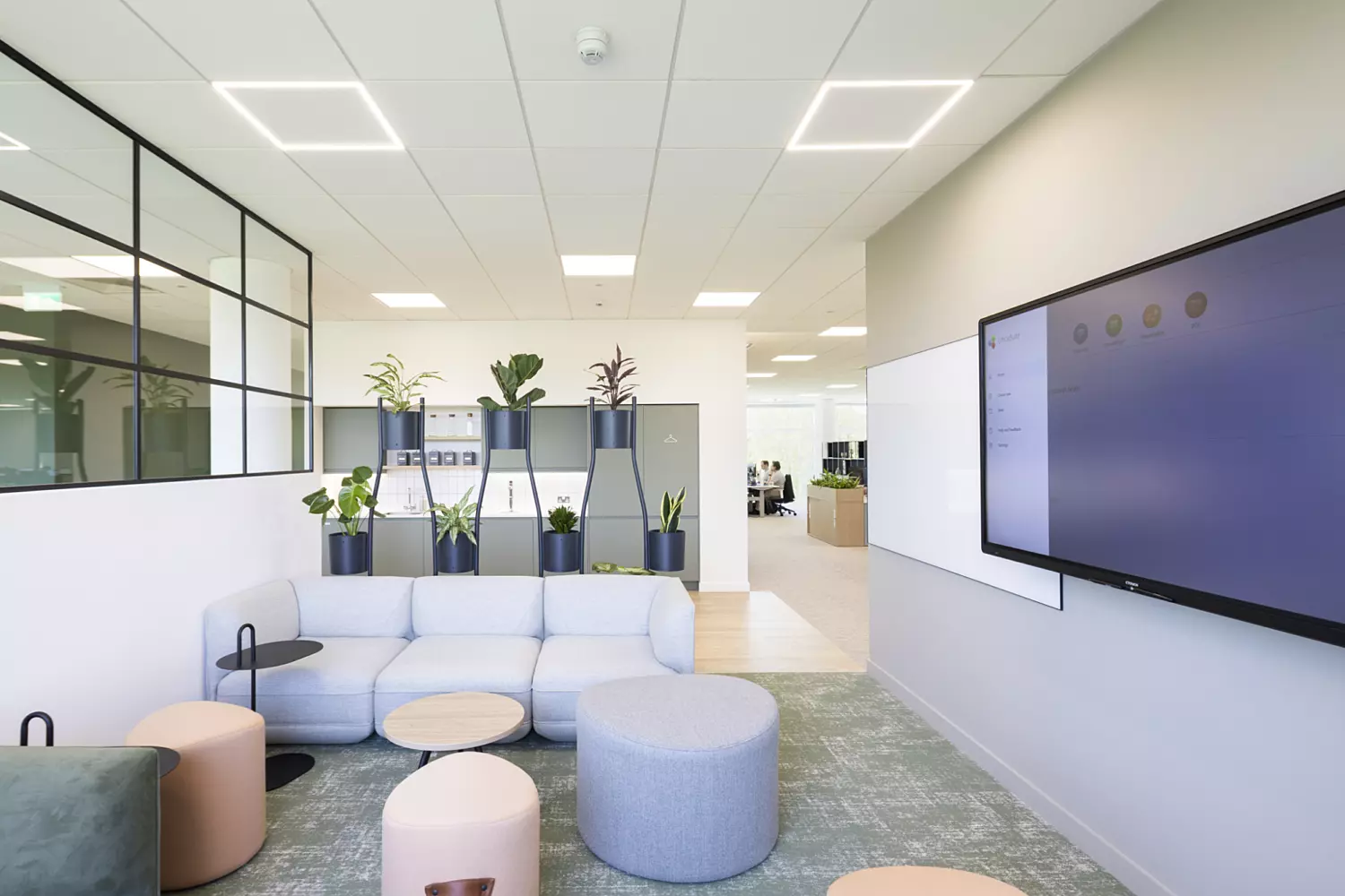From the welcoming entrance with lake views and a glowing Ridge sign, the space opens into open plan desks, breakout booths and meeting rooms. We relocated the breakout zone to reduce noise and keep the best views for working areas. The spacious kitchen doubles as a hub for town halls and team events.