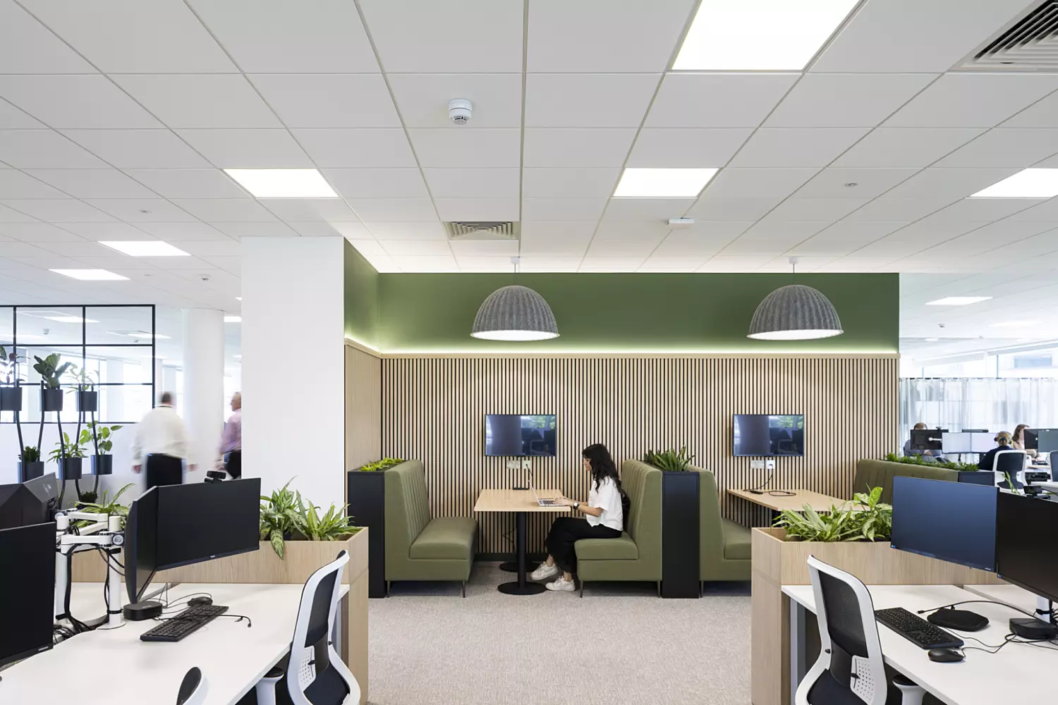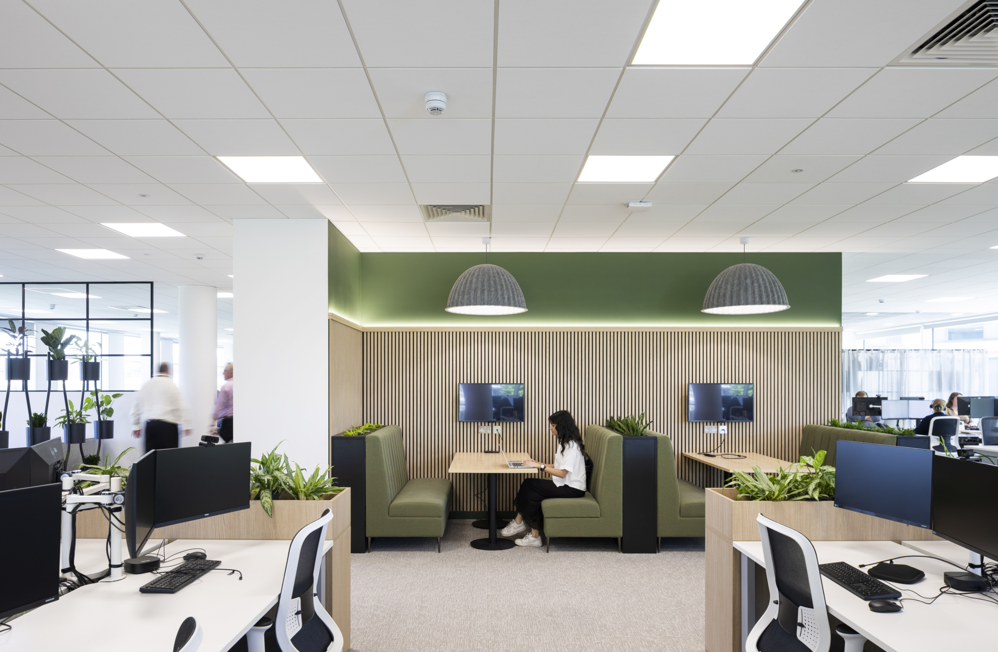 Ridge wanted a high quality, flexible layout centred around their brand. The design includes collaborative zones, phone pods and an impressive boardroom – all tied together with deep green tones, natural wood and textured finishes. Planters and natural colours add a relaxed feel without compromising focus.